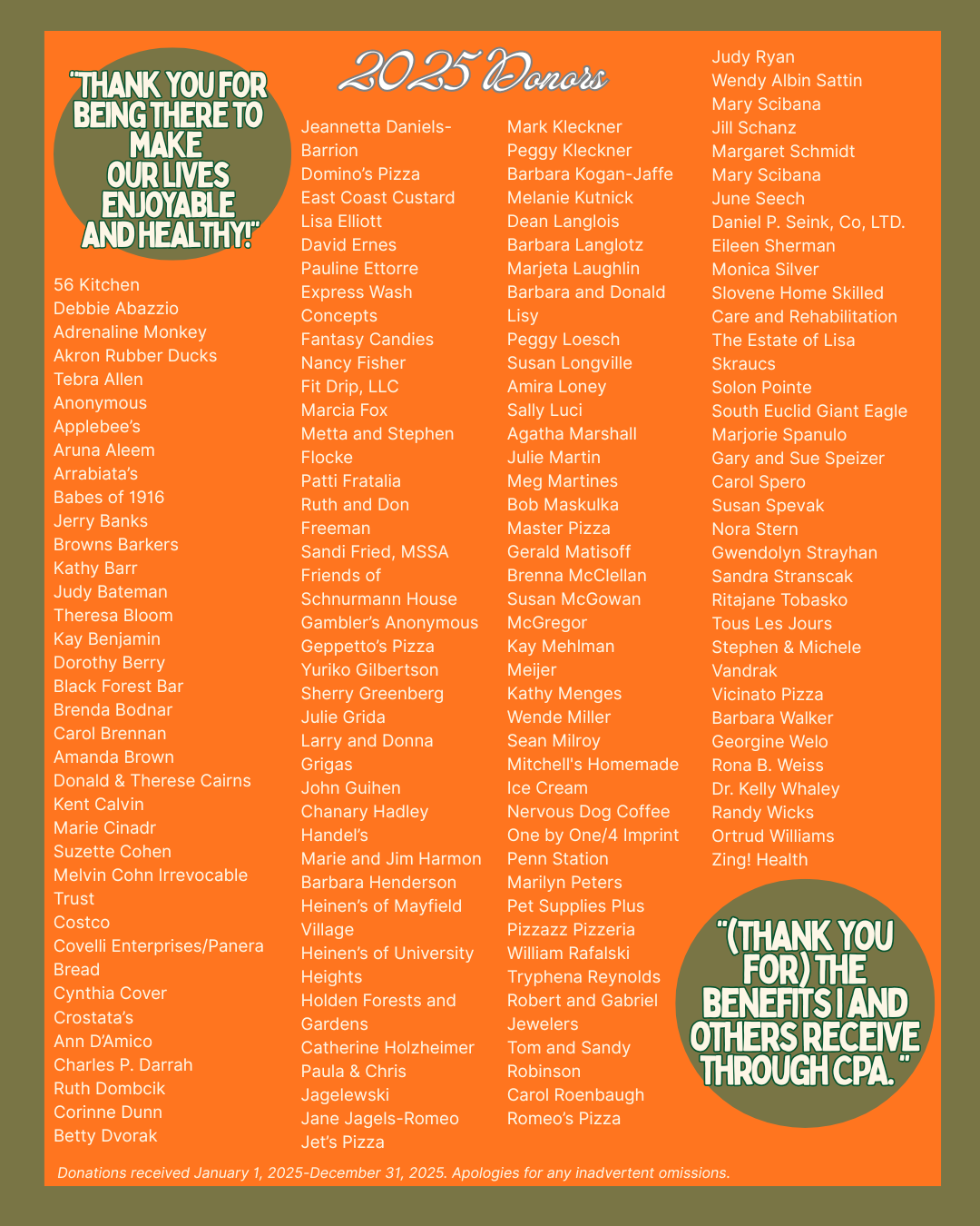 Value-added, no- or low-fee services that we provide include transportation, social work services, volunteer services/opportunities, fresh produce and shelf stable food distribution, minor home safety modifications, technology programs, congregate and speciality lunches, scratch-prepared meals, and social/educational/wellness programs. CPA is a vital link to and is often the only source of meals, programs, services, and socialization for many older adults.